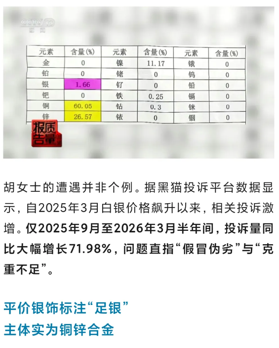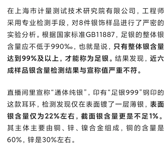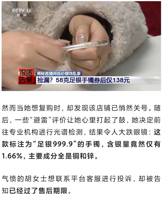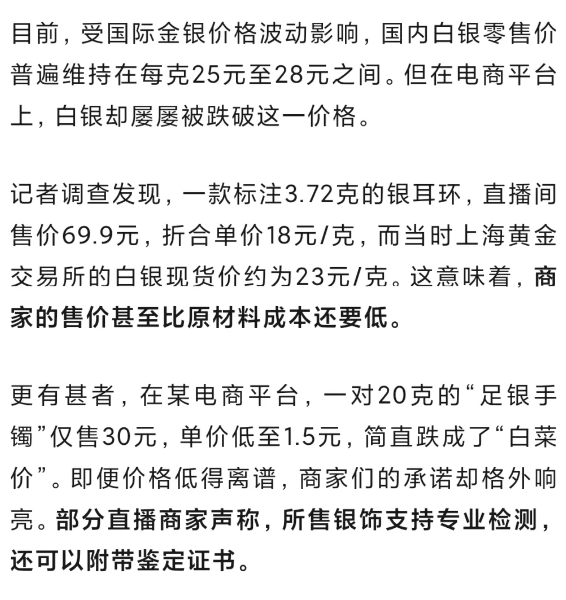 在白银价格高位运行的当下,网络直播间内,不少商家借势推出了低于行情单价的“福利价”“清仓价”,诱导消费者下单。然而,满心期待的“捡漏”往往变成了“踩坑”。这种远低于原材料成本的所谓“足银饰品”,真相到底如何?