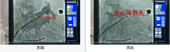 手术当天,刘燕锋博士通过股静脉穿刺建立微小通道,在影像设备引导下精准找到左心耳,平稳释放封堵器,将这个容易长血栓的部位彻底封闭。整个过程操作流畅、定位精准,仅用40分钟就顺利完成。