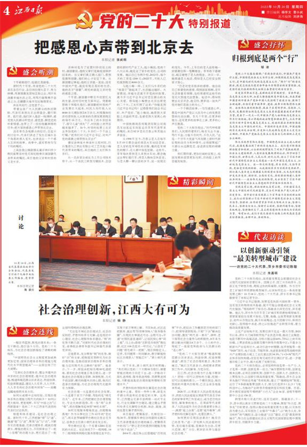 在潜心研读中领悟精神,在学习讨论中鼓足干劲。连日来,党的二十大江西省代表团代表踊跃发言,结合工作实际畅谈学习党的二十大报告的深刻体会。代表们说,党的二十大报告系统擘画了以中国式现代化推进中华民族伟大复兴的宏伟蓝图,是全党全国各族人民奋进新征程、建功新时代的纲领性文献。大家一致表示,作为十年伟大变革的亲历者、见证者、参与者,深感荣幸与自豪。立足新时代新征程,将深入学习宣传贯彻党的二十大精神,以更加饱