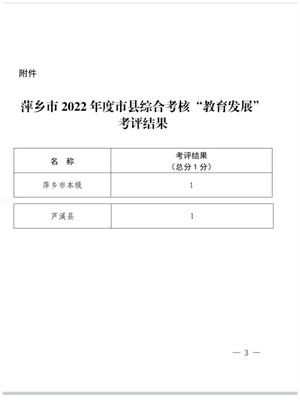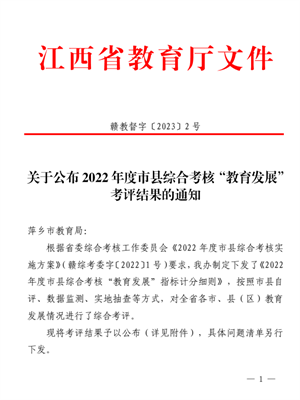 高质量考评全省领先。在2022年江西省教育高质量发展考评中荣获全省第一名,成为全省唯一连续八年教育高质量考评稳居前三甲的县区,其中连续三年蝉联全省第一名。