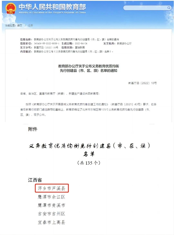 4月,芦溪县被确定为全国义务教育优质均衡发展先行创建县。