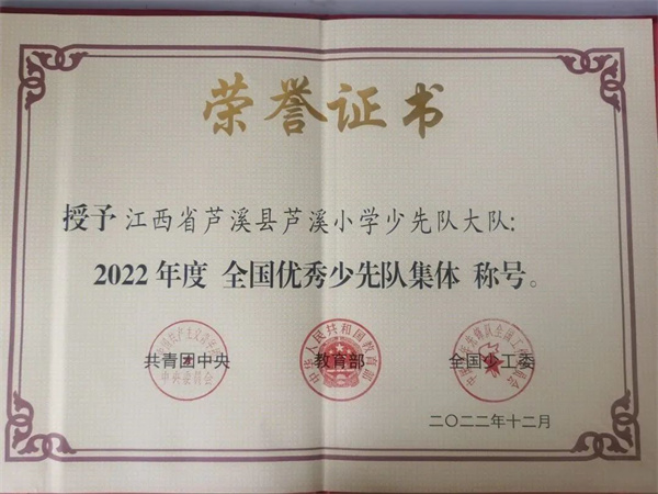 芦溪小学少先队大队荣获“2022年度全国优秀少先队集体”。