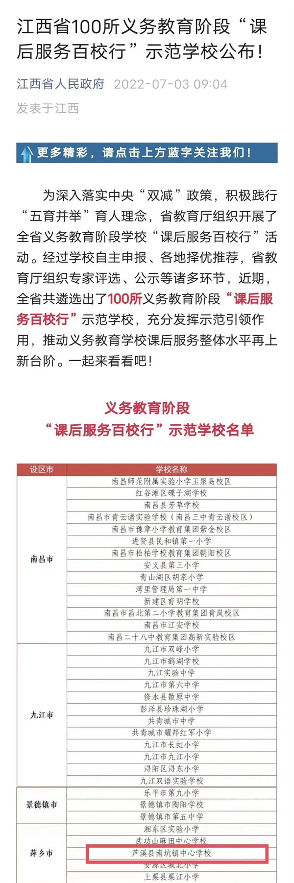 南坑镇中心学校获评全省义务教育阶段“课后服务百校行”示范学校。