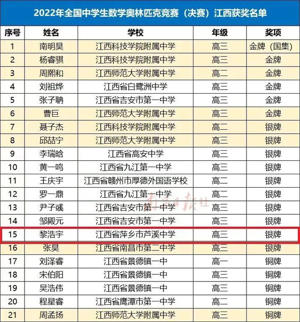 芦溪中学学生黎浩宇荣获第38届中国数学奥林匹克竞赛银牌。