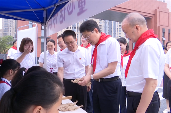 在安源学校红星广场,少先队员们为熊运浪一行系上鲜艳的红领巾。熊运浪微笑着与孩子们交谈,祝大家节日快乐。随后,在红领巾讲解员的带领下,熊运浪观看了学校首届书法艺术节师生作品展和轮滑展示、武术操表演等,参观了火车头宣传阵地。在学校报告厅内,学生们内容丰富、形式新颖的莲花落《安源山下娃娃红》、舞蹈《小花旦》收获了熊运浪的频频掌声。
