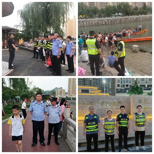▲县公安局民警、镇村两级党员干部、应急分队、义务巡防队、志愿者在栗水河开展安全巡查,对人员密集的重点区域进行不间断巡逻值守。在巡查中,对围观人员扎堆并依靠石栏杆人员进行及时劝导疏散,发现翻越栏杆及时制止;对沿河两岸各码头人员戏水、捞鱼以及围观龙船下水位置人员扎堆等情况进行劝导制止、劝返,防止人员溺水,维护训练赛场及周边治安秩序;对存在安全隐患的栏杆进行加固。