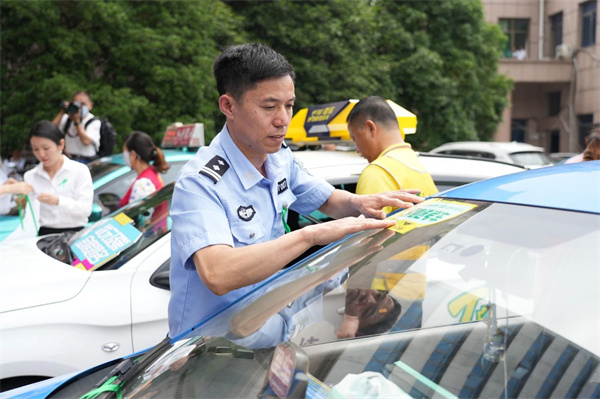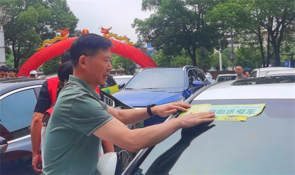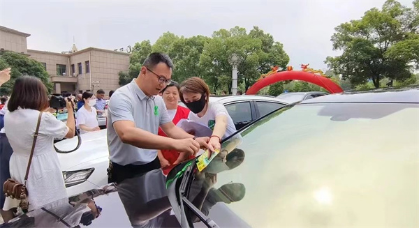 ▲为爱心送考车辆贴车标、系绿丝带