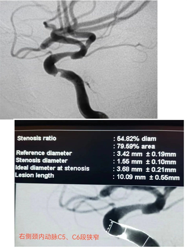 入院后,以李金亮主任为首的神经外科团队组织科内会诊,讨论后在局麻下行经股动脉全脑血管造影术。脑血管DSA造影提示:右侧颈内动脉C5段重度狭窄,狭窄率约80%,C6段轻度狭窄,狭窄率约40%。