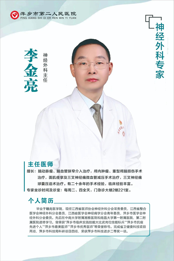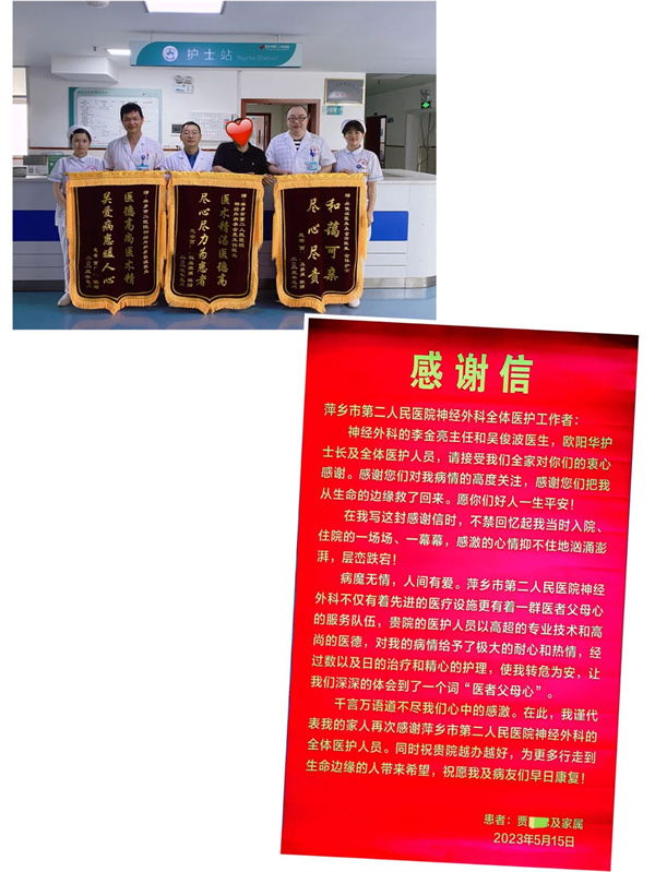 萍乡市第二人民医院神经外科成立于1997年,是萍乡市成立较早的神经外科专科,为萍乡市重点学科。科室现有医务人员31人,正高职称2人,副高职称6人,研究生2人,在职研究生6人。科室总床位数45张,病床使用率约105%。科室以治疗脑血管病(脑出血、脑动脉瘤、脑动静脉畸形、脑动脉狭窄)、颅脑损伤、脑肿瘤、神经重症、功能神经外科(癫痫、三叉神经痛、面肌痉挛)为主,显微神经外科及神经介入为特色亚专科,诊治效果达市内领先、省内先进水平。神经外科重症监护室(NICU)备有脑功能监护仪、颅内压监测仪、无创血流动力学监测仪、有创血流动力学监测仪、冰毯机、呼吸机、CRRT机等;常规开展了颅内压监测、脑电图监测、诱发电位监测、重症床旁超声、TCD脑血流监测等神经重症患者多模态监测,无创和有创血流动力学监测,纤支镜治疗,有创和无创呼吸机辅助呼吸治疗、CRRT等诊疗项目,为广大颅脑创伤及神经外科危重症患者提供安全保障,以良好的诊治效果及服务赢得社会各界好评。