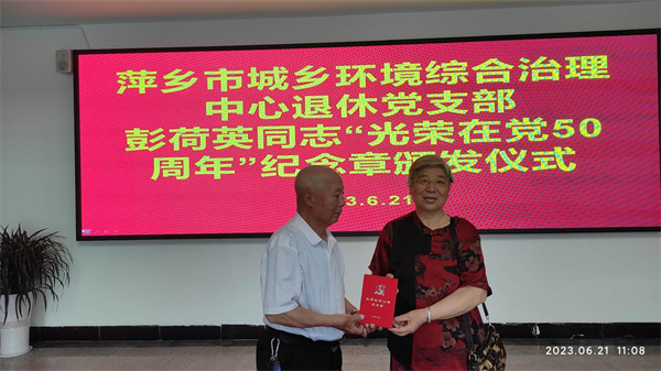 为充分体现党和政府对老党员的关怀和肯定,近日,中共萍乡市城乡环境综合治理中心退休支部委员会召开主题党日活动,将中共中央颁发的第二批“光荣在党50周年纪念章”颁发到退休党员彭荷英手中。
