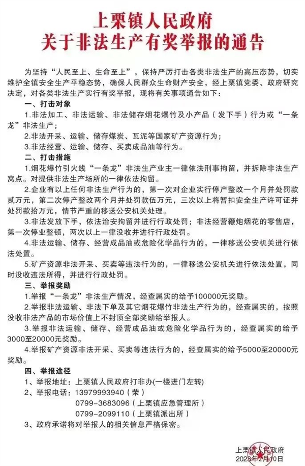 此次行动严厉打击了非法生产烟花爆竹涉案人员的嚣张气焰,达到了震慑效果。接下来,上栗镇将始终保持对烟花爆竹非法生产重拳严打的高压态势,不断强化对烟花爆竹非法生产、储存、运输、经营等各个环节的排查力度,确保辖区安全生产形势平稳。同时,希望广大父老乡亲能充分认识非法生产的严重危害性,坚决同非法生产行为做斗争,不断增强自我保护意识,积极举报各类花炮非法生产行为。