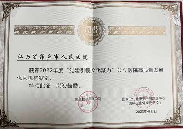 2022年,健康报社与国家卫生健康委干部培训中心(国家卫生健康委党校)联合开展“党建引领 文化聚力”公立医院高质量发展宣传交流活动并开设专栏。萍乡市人民医院报送的《“点、线、面”同步发力 持续激发医疗服务新动能》案例在参选案例中脱颖而出,被评为2022年度“党建引领 文化聚力”公立医院高质量发展优秀机构案例。
