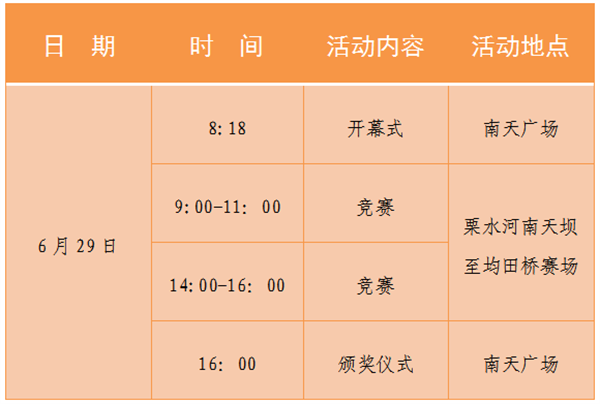 2.比赛采用分组计时,赛制为上午一水、下午一水计总成绩,按两轮总成绩排出1-16名。设优秀组织奖、道德风尚奖、最佳人气奖若干。比赛分组和赛道在领队、教练与裁判联席会上决定;赛道、舟号于赛前在检录处抽签确定。