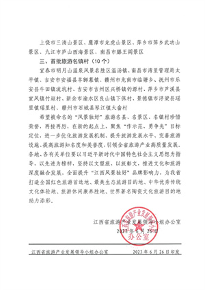 宜春市明月山温泉风景名胜区温汤镇、南昌市湾里管理局太平镇、吉安市安福县羊狮慕镇、赣州市龙南市临塘乡、抚州市乐安县牛田镇流坑村、吉安市吉州区兴桥镇钓源村、萍乡市芦溪县宣风镇竹垣村、新余市渝水区良山镇下保村、景德镇市浮梁县瑶里镇瑶里村、赣州市石城县琴江镇大金村