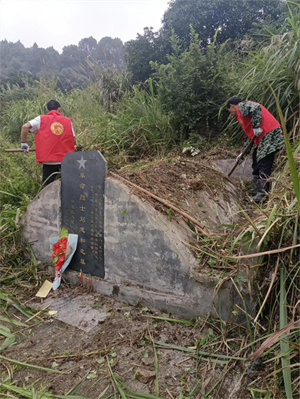 在烈士纪念日前夕,镇志愿者为辖区的烈士墓进行祭扫,擦拭墓碑,清理杂草,敬献鲜花。