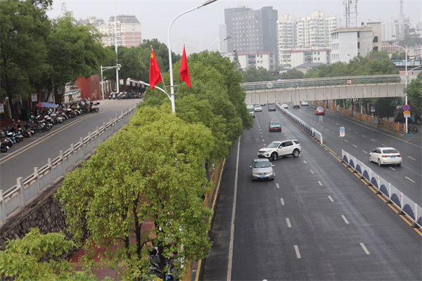 喜迎国庆,升挂国旗,祝福祖国。道路两旁的路灯杆上,伴随着秋风阵阵,一面面鲜艳的五星红旗迎风飘扬,在绿树的映衬下,形成了一道靓丽的风景线,不仅把整座城市装扮一新,更让市民们感受到了浓浓的节日氛围。