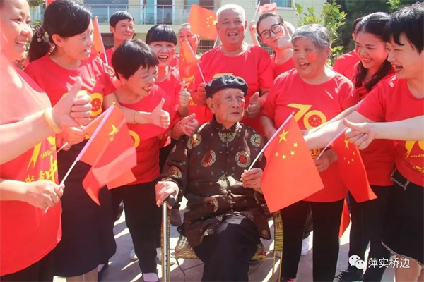 百岁老人将升国旗的接力棒