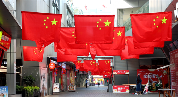 不仅在广场、道路上,同样被满城涌动的“中国红”装点着的还有附近商圈,众多商场超市门前的一抹抹中国红汇聚成了国庆的主题色彩,显得格外耀眼和喜庆,让过往的市民感受到了浓浓的节日氛围。