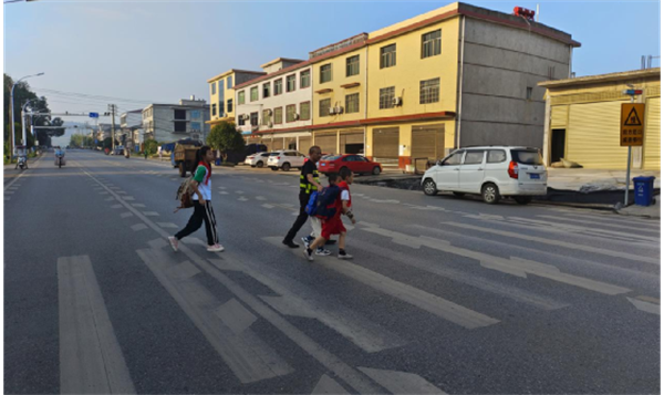 由于横水小学附近住户多且分布密集,加上319国道穿境而过,每逢学生集中离返校时,横水小学门口接送学生的车辆、人流量就会剧增,造成交通拥堵,给学生带来安全隐患。为了破解这一难题,在上学期间这里都会有一批“护学岗”队伍,为孩子们保驾护航。