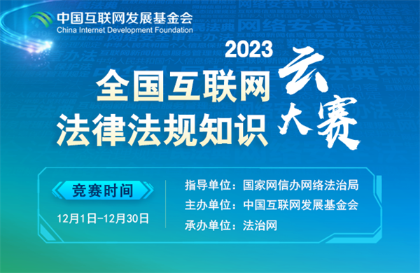 网络法治宣传教育是依法治网的长期基础性工作,是推进网信事业健康发展的必然要求。为深入学习宣传贯彻习近平法治思想、习近平总书记关于网络强国的重要思想,立足新发展阶段、贯彻新发展理念、构建新发展格局,提升网信系统干部、互联网从业人员、广大网民网络法治素养,推进依法治网、依法办网、依法上网,为网络强国建设营造良好的法治环境,根据《网信系统法治宣传教育第八个五年规划(2021-2025)》,经批准,由国家网信办法治局指导,中国互联网发展基金会主办的2023全国互联网法律法规知识云大赛计划于2023年12月1日正式启动,为期1个月。