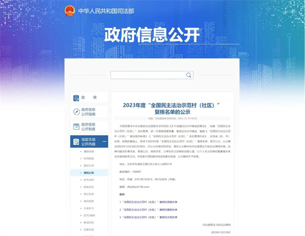 为贯彻落实中央全面依法治国委员会印发的《关于加强法治乡村建设的意见》,加强“全国民主法治示范村(社区)”动态管理,进一步提高创建质量,推进法治乡村建设,根据《“全国民主法治示范村(社区)”建设指导标准》《“全国民主法治示范村(社区)”命名管理办法》,在各省(区、市)自查、初核的基础上,形成了2023年度“全国民主法治示范村(社区)”复核名单,现予公示,公示期自2023年12月20日至29日。对公示名单如有异议,请在公示期内向司法部普法与依法治理局反映。反映问题须实事求是、客观公正、具体详实,以单位名义反映的须盖公章,以个人名义反映的要署真实姓名并提供联系方式。对线索不清的匿名电话和匿名信函,公示期间不予受理。