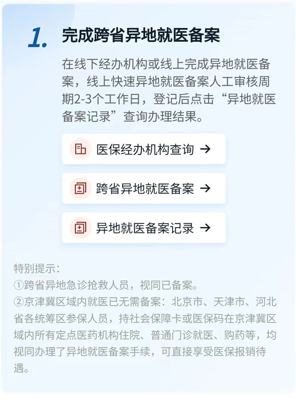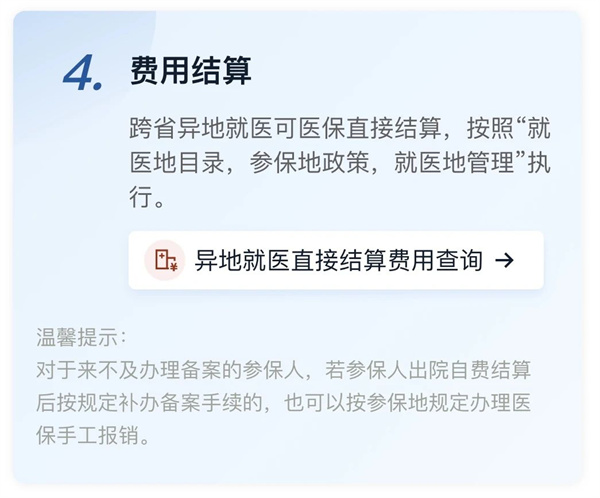 完成跨省异地就医备案 ➡ 激活医保码 ➡ 选择定点机构看病就医 ➡ 费用结算