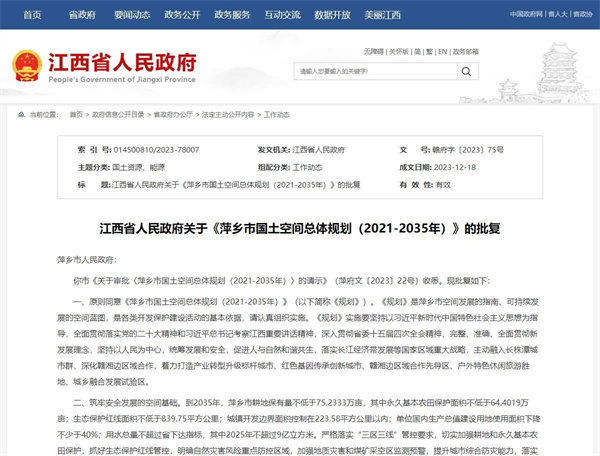 萍乡市人民政府:你市《关于审批〈萍乡市国土空间总体规划(2021-2035年)〉的请示》(萍府文〔2023〕22号)收悉。现批复如下: