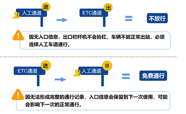 特别是在人工通道上的高速,下高速时不要选择ETC通道,否则将无法正常通行,因没有入口信息,出口栏杆机不会抬杆,只能折返至人工车道驶出。