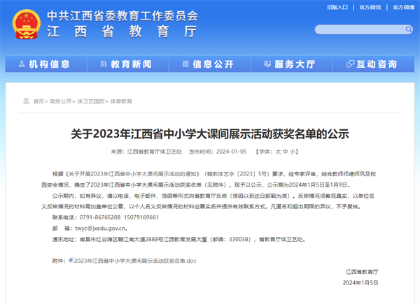 根据《关于开展2023年江西省中小学大课间展示活动的通知》(赣教体艺字〔2023〕5号)要求,经专家评审,综合教师师德师风及校园安全情况,省教育厅确定了2023年江西省中小学大课间展示活动获奖名单(见附件)。现予以公示,公示期为2024年1月5日至1月9日。公示期内,如有异议,请以电话、电子邮件、信函等形式向省教育厅反映(信函以到达日邮戳为准)。反映情况须客观真实,以单位名义反映情况的材料需加盖单位公章,以个人名义反映情况的材料应署实名并提供有效联系方式。凡匿名和超出期限的异议,不予复核。