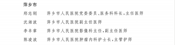 近日,《江西省卫生健康委员会关于表彰江西省医疗卫生工作先进集体和先进医务工作者的决定》发布,萍乡市人民医院荣获“江西省医疗卫生工作先进集体”称号,该院4位医护人员郑志刚、李丰章、沈湘波、陈凌波获评“江西省先进医务工作者”称号。