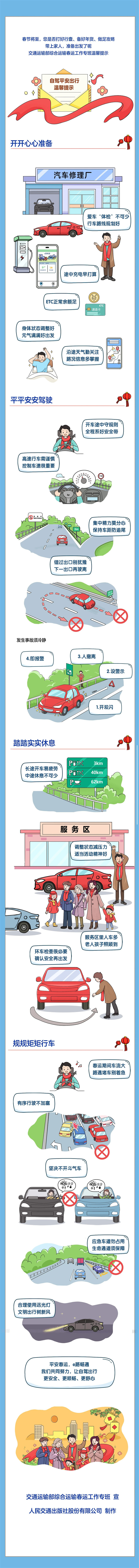 自驾出行要提前了解天气情况以及车况、路况,做好充足准备;避免夜间行车,不超员超速,疲劳驾驶;驾车过程中保持精神集中,不玩微信、抢红包、刷视频。客车出行要选择正规营运客车,全程系好安全带,不乘坐“黑车”、超员面包车,发现违法行为主动报警。