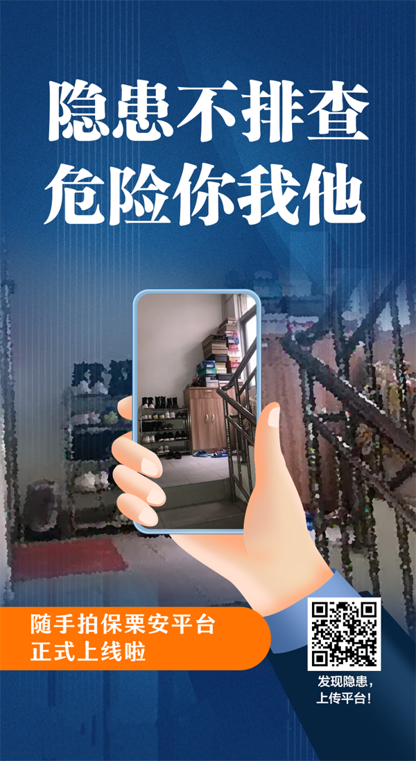 为确保安全隐患排查全覆盖、零死角,做到早发现、处置,更快更直接消除群众身边的安全隐患,切实守护人民群众生命财产安全,即日起,上栗县安委会推出“随手拍、保栗安”平台,平台将根据广大群众提供的安全隐患问题进行分流交办,跟踪督办并及时回复广大群众。