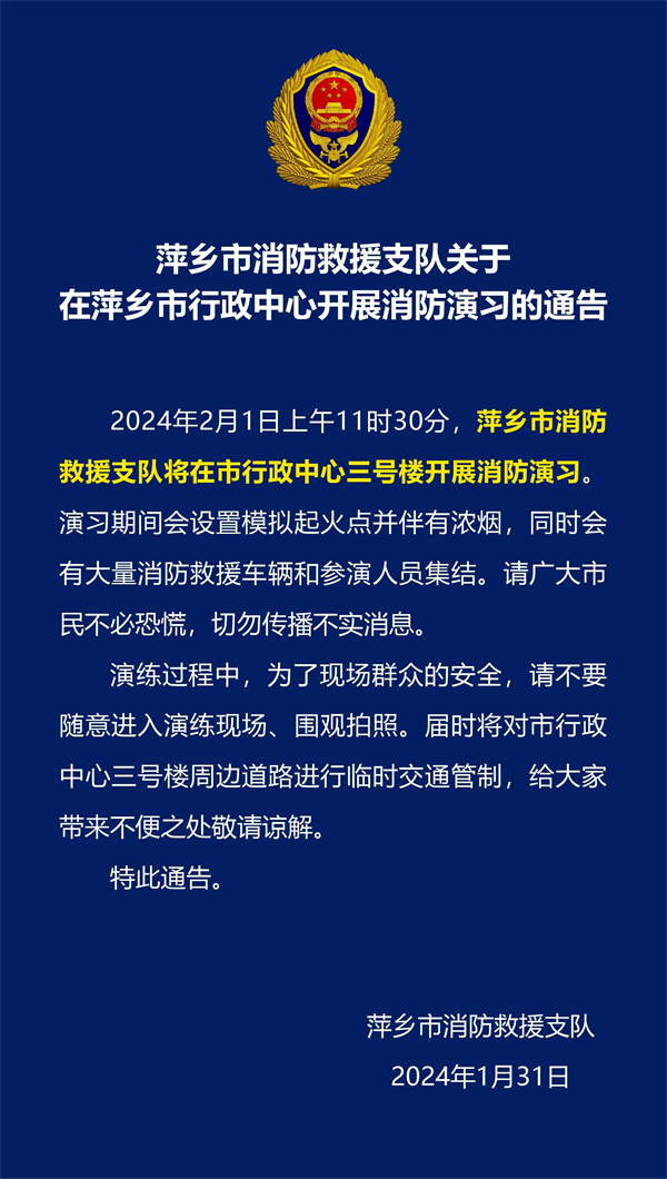 2024年2月1日上午11时30分,萍乡市消防救援支队将在市行政中心三号楼开展消防演习。演习期间会设置模拟起火点并伴有浓烟,同时会有大量消防救援车辆和参演人员集结。请广大市民不必恐慌,切勿传播不实消息。
