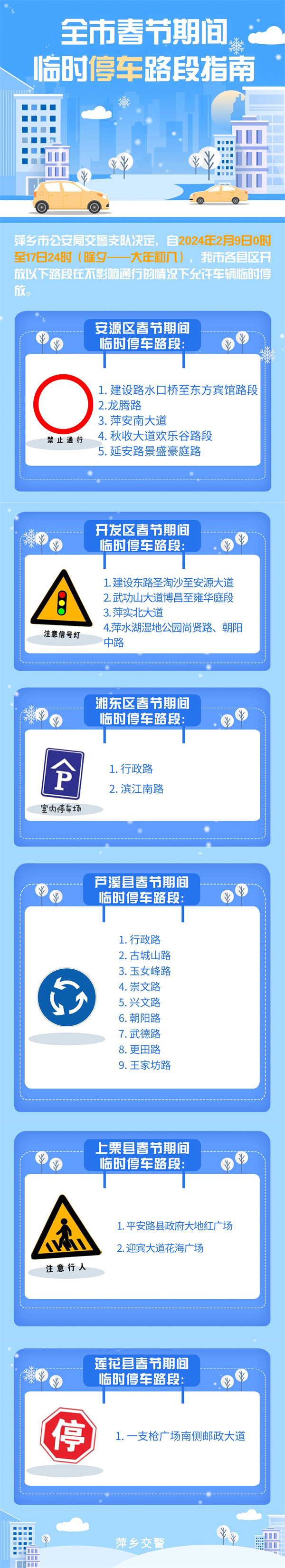 为全力保障春节期间我市道路交通安全畅通有序,切实缓解全市各县区春节期间车辆停放压力,方便广大市民出行,萍乡市公安局交警支队决定,自2024年2月9日0时至17日24时(除夕——大年初八),我市各县区开放以下路段在不影响通行的情况下允许车辆临时停放。