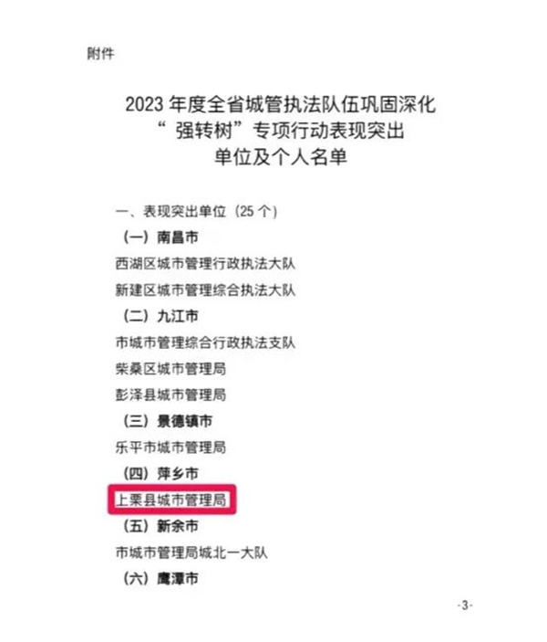 上栗县城市管理局获评全省城管执法队伍巩固深化“强转树”专项行动表现突出单位