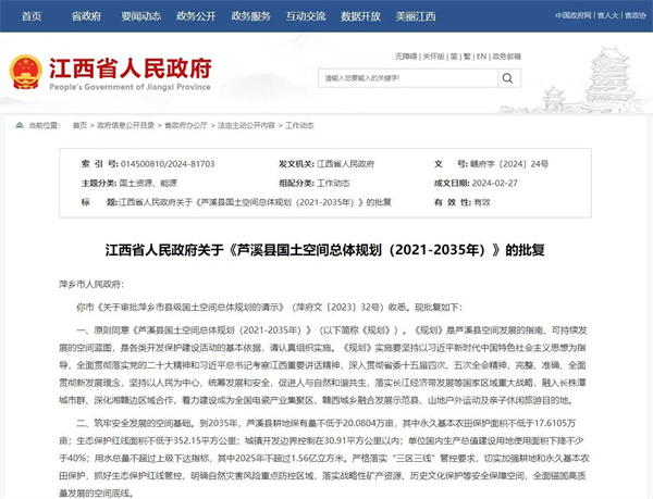 江西省人民政府关于《芦溪县国土空间总体规划(2021-2035年)》的批复