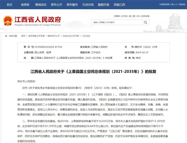 江西省人民政府关于《上栗县国土空间总体规划(2021-2035年)》的批复