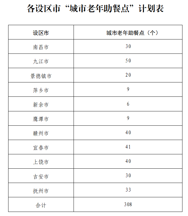 省级层面出台《江西省加快发展老年助餐服务实施方案》;3月底前,设区市出台具体工作措施或方案。适时召开全省老年助餐服务工作现场推进会。