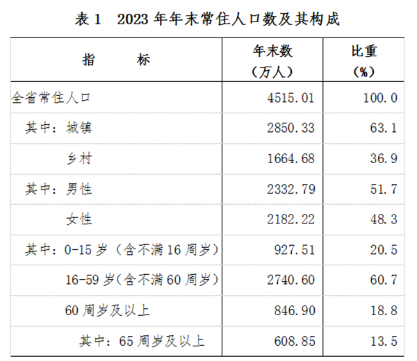 年末全省常住人口4515.01万人,比上年末减少12.97万人。其中,城镇常住人口2850.33万人,占总人口的比重(常住人口城镇化率)为63.13%,比上年末提高1.06个百分点。全年出生人口29.5万人,比2022年减少3.0万人;死亡人口33.3万人,增加1.9万人。人口出生率6.52‰,比2022年下降0.67个千分点;人口死亡率7.36‰,上升0.42个千分点;自然增长率为-0.84‰,下降1.09个千分点。