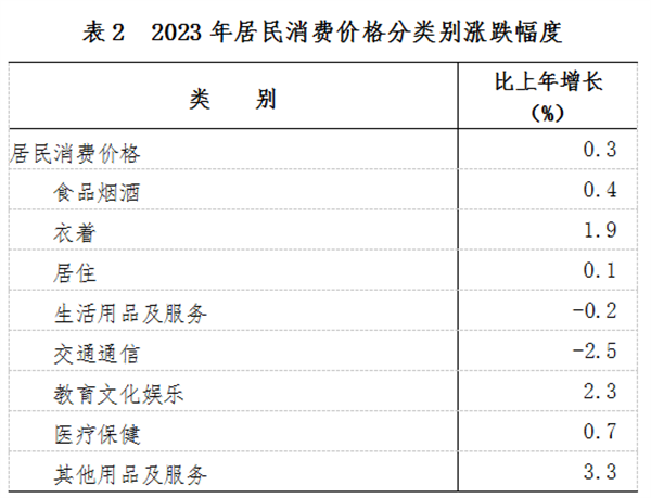 全年居民消费价格比上年上涨0.3%。工业生产者出厂价格下降3.4%。工业生产者购进价格下降4.2%。农产品生产者价格下降4.7%。