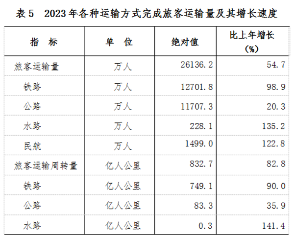 全年旅客运输量26136.2万人,比上年增长54.7%;旅客运输周转量832.7亿人公里,增长82.8%。