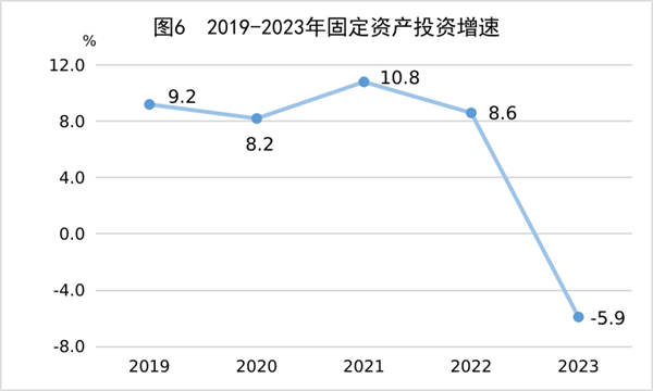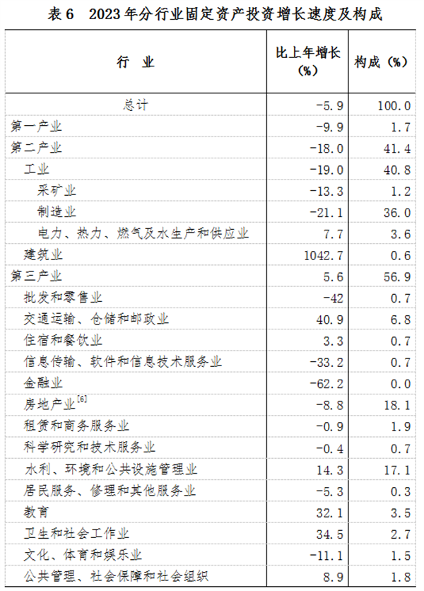 全年固定资产投资比上年下降5.9%。第一产业投资下降9.9%,第二产业投资下降18.0%,第三产业投资增长5.6%。民间投资下降18.0%。基础设施投资增长19.1%。社会领域投资[5]增长21.4%。