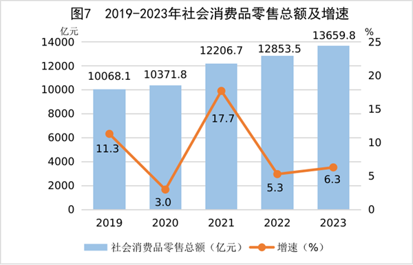 全年社会消费品零售总额13659.8亿元,比上年增长6.3%。按经营地分,城镇消费品零售额11475.1亿元,增长6.1%,其中城区消费品零售额6758.8亿元,增长4.5%;乡村消费品零售额 2184.6亿元,增长7.1%。按消费类型分,商品零售额12126.0亿元,增长5.2%;餐饮收入1533.7亿元,增长15.9%。限额以上单位消费品零售额4999.4亿元,增长2.2%。网上零售额3107.6亿元,增长13.8%,其中实物商品网上零售额2734.5亿元,增长11.8%。