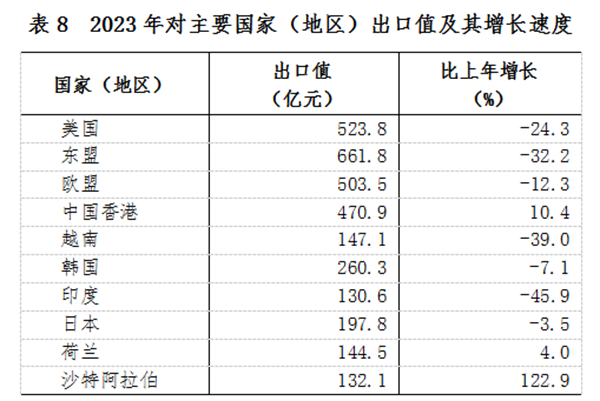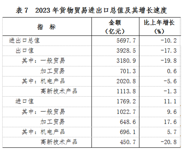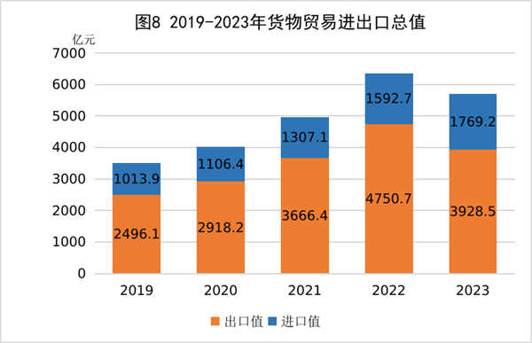 全年货物贸易进出口总值5697.7亿元,比上年下降10.2%。其中,出口值3928.5亿元,下降17.3%;进口值1769.2亿元,增长11.1%。对共建“一带一路”国家进出口2727.7亿元,占比47.9%,同比提升0.8个百分点。
