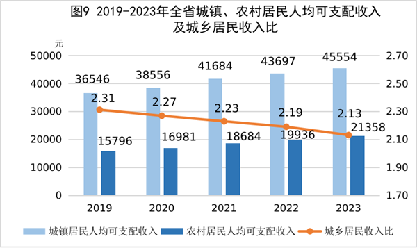 全年居民人均可支配收入34242元,比上年增长5.6%。按常住地分,城镇居民人均可支配收入45554元,增长4.2%;农村居民人均可支配收入21358元,增长7.1%。城乡居民人均可支配收入比值为2.13,比上年缩小0.06。