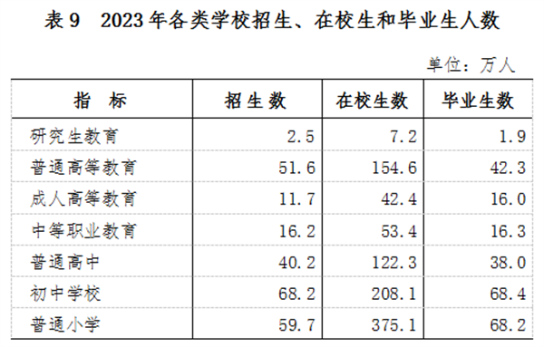 年末共有普通高等学校(含普通、职业本专科)109所,普通高中568所,中等职业学校272所,初中阶段学校2249所,小学5830所。民办学校6665所。特殊教育在校生3.8万人。学前教育在园幼儿132.4万人。高中阶段毛入学率为93.9%,普通高考录取率为78.1%。