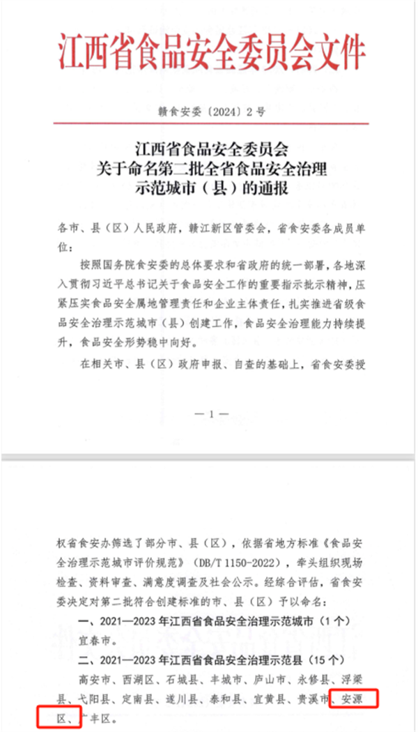 喜报!萍乡市安源区成为第二批全省食品安全治理示范县