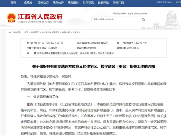 为落实国务院《地名管理条例》和《江西省地名管理办法》要求,做好我省权限范围内具有重要地理方位意义的住宅区、楼宇的命名、更名工作,现将有关事项通知如下: