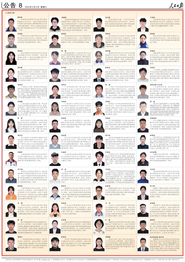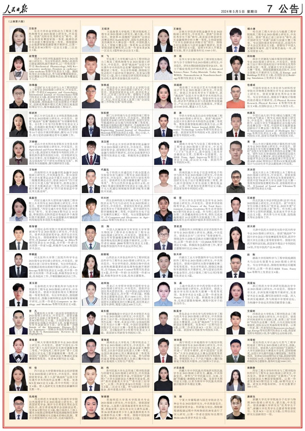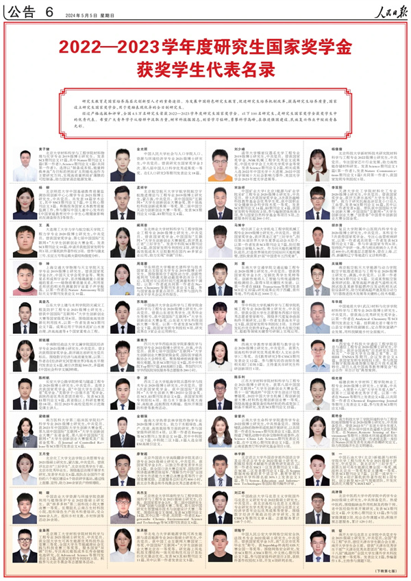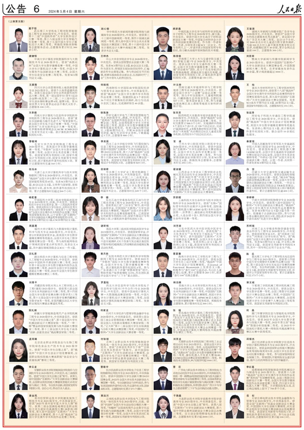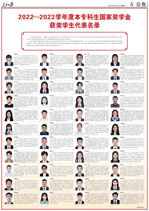5月4日、5日出版的人民日报,用六个整版刊登了100名研究生国家奖学金获奖学生优秀代表、100名本专科生国家奖学金获奖学生优秀代表、100名中等职业教育国家奖学金获奖学生优秀代表名录。