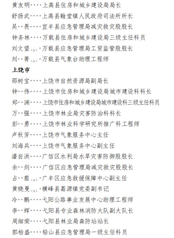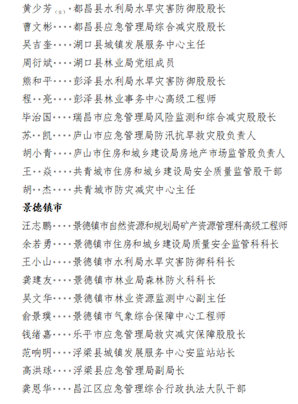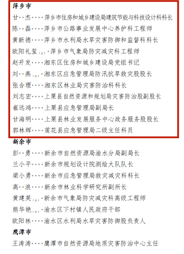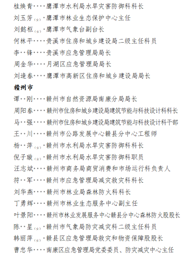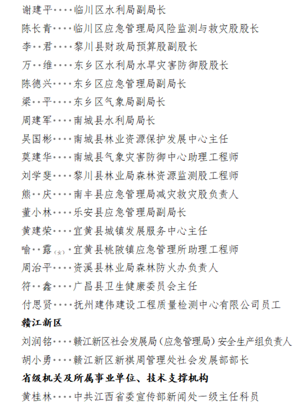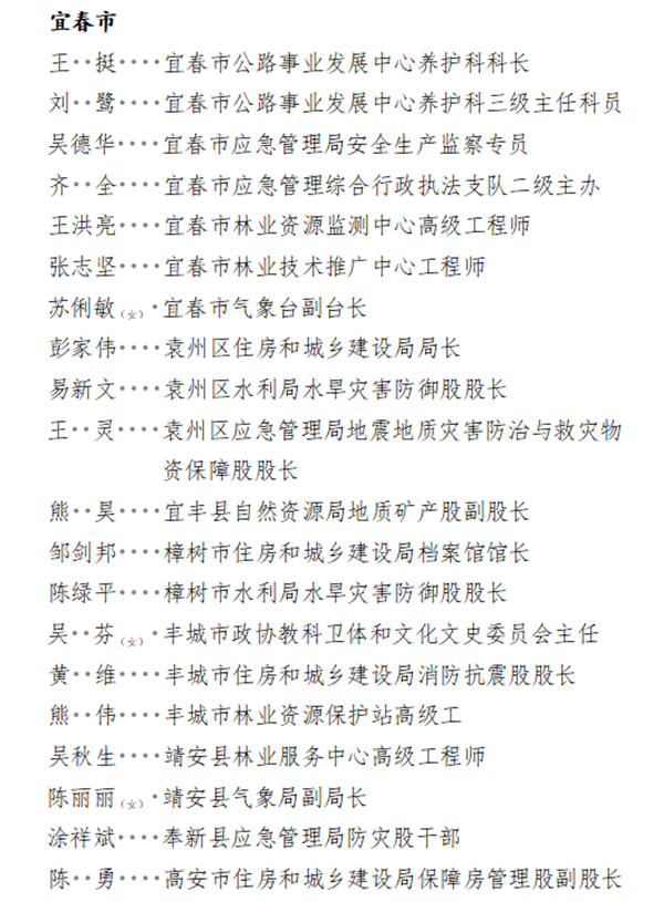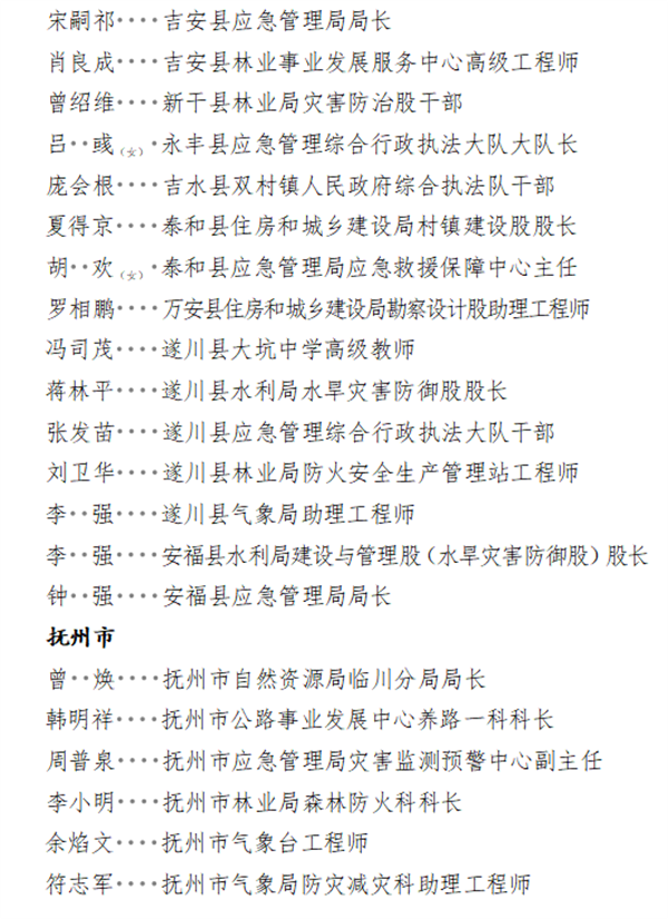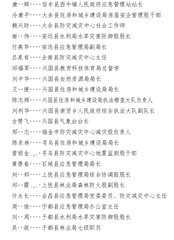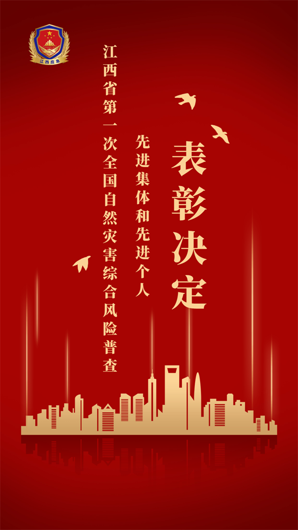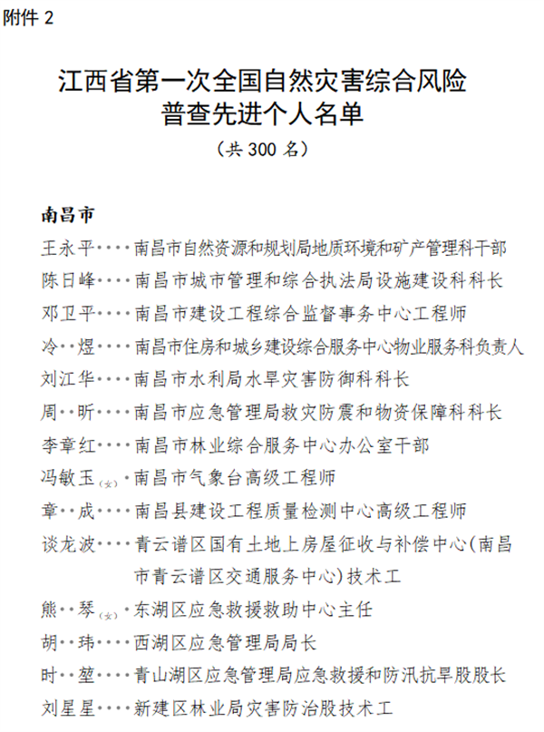 为表彰先进,江西省第一次全国自然灾害综合风险普查领导小组办公室、省应急管理厅决定,授予南昌市住房和城乡建设局等100个单位为“江西省第一次全国自然灾害综合风险普查先进集体”称号,授予王永平等300名同志为“江西省第一次全国自然灾害综合风险普查先进个人”称号。希望受到表彰的集体和个人珍惜荣誉,再接再厉,各有关部门和广大干部职工要以先进集体和先进个人为榜样,以更强的担当、更实的举措,锐意进取、笃行不怠,为提升全省自然灾害防治能力贡献智慧和力量,为奋力谱写中国式现代化江西篇章作出更大贡献!